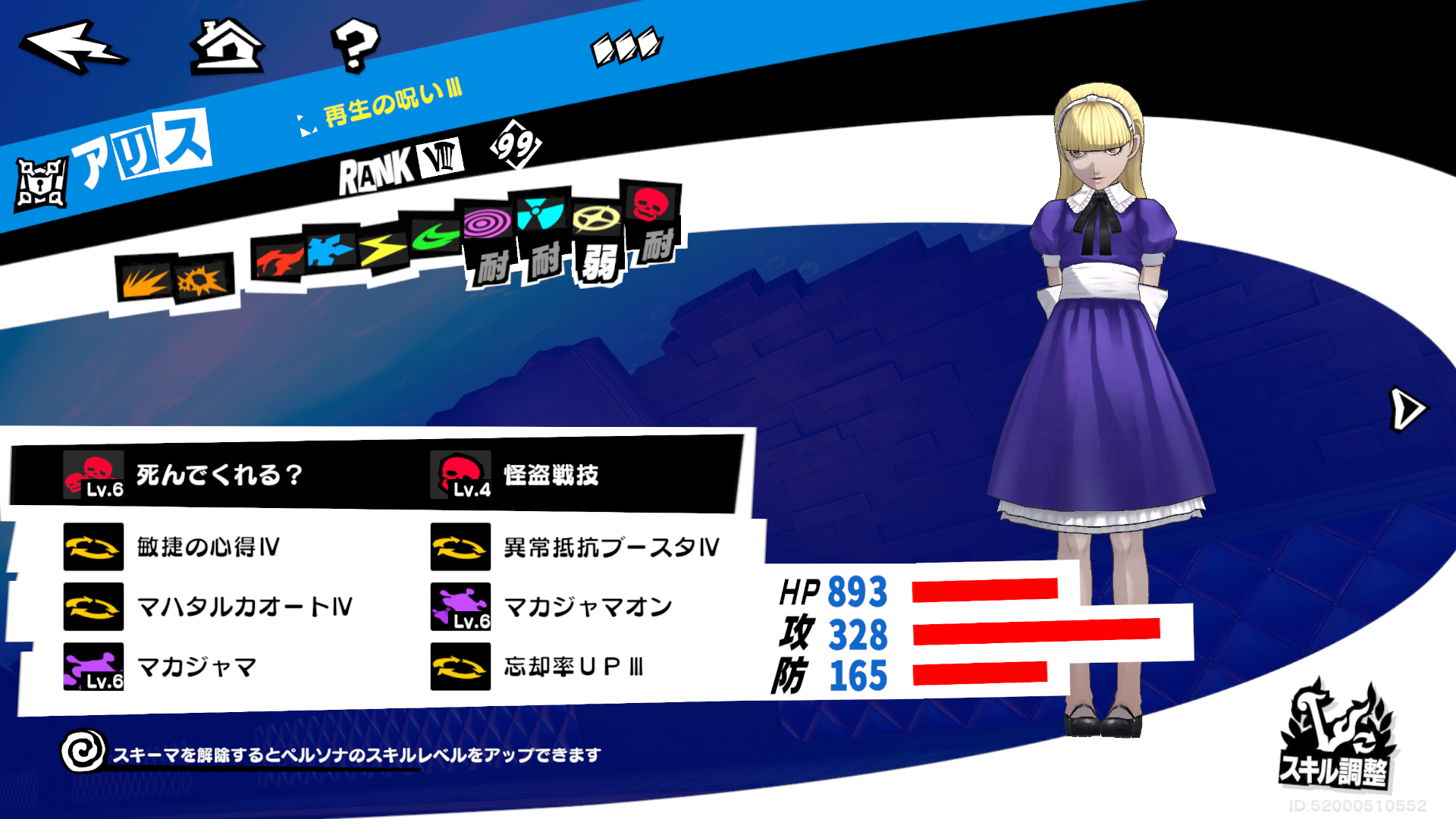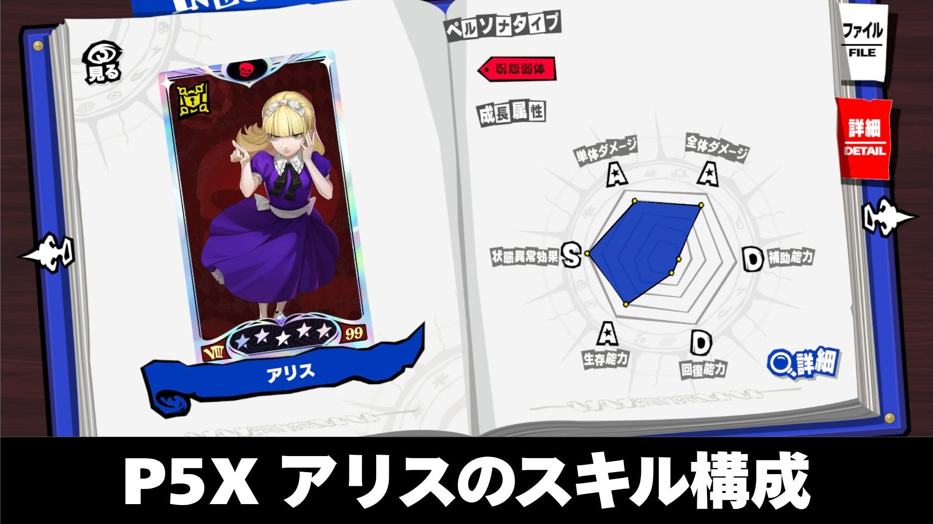 ペルソナ5x(P5X)のアリスのスキル構成と作り方を解説。マカジャマ・マカジャマオンなどの忘却構成、ベルベットルーム用の構成についても記載。